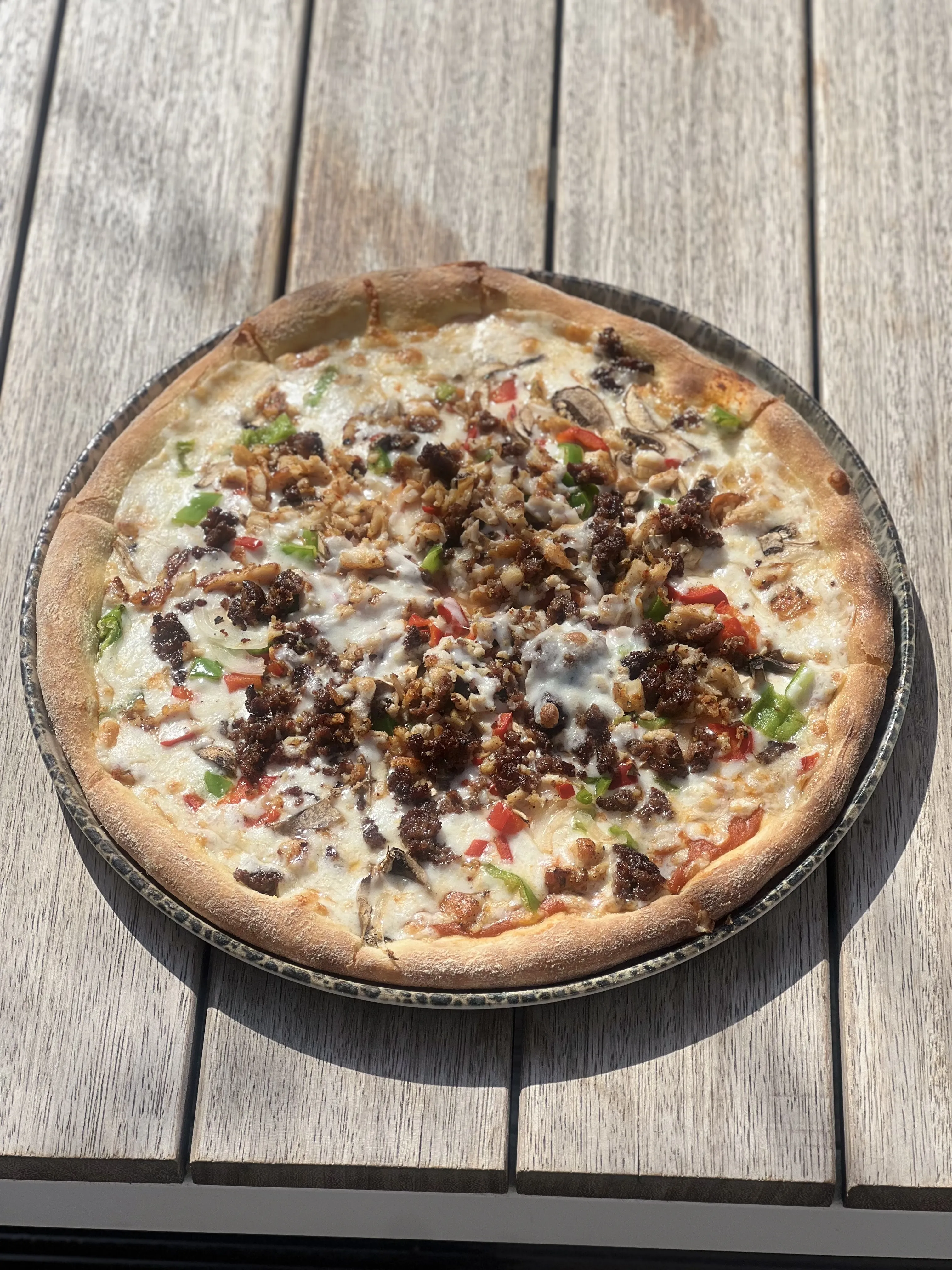 PIZZA SOSU ÜZERINE MOZERALLA PEYNİRİ,KIYMA,IZGARA TAVUK,ÇERİ DOMATES,SOĞAN,MANTAR,KIRMIZI BİBER,YEŞİL BİBER
